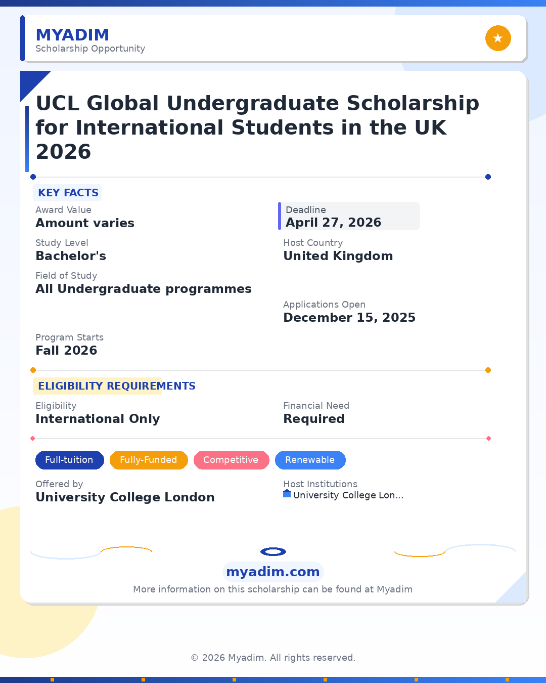 The UCL Global Undergraduate Scholarship is a major financial support program created by University College London to help talented international students who cannot fully afford the cost of studying in the UK. The goal of this scholarship is simple: to make sure that students with strong academic ability are not held back because of money.